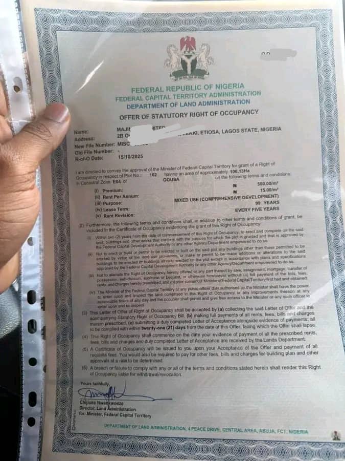 - Verification: Legal and technical search conducted with FCDA to confirm land authenticity.